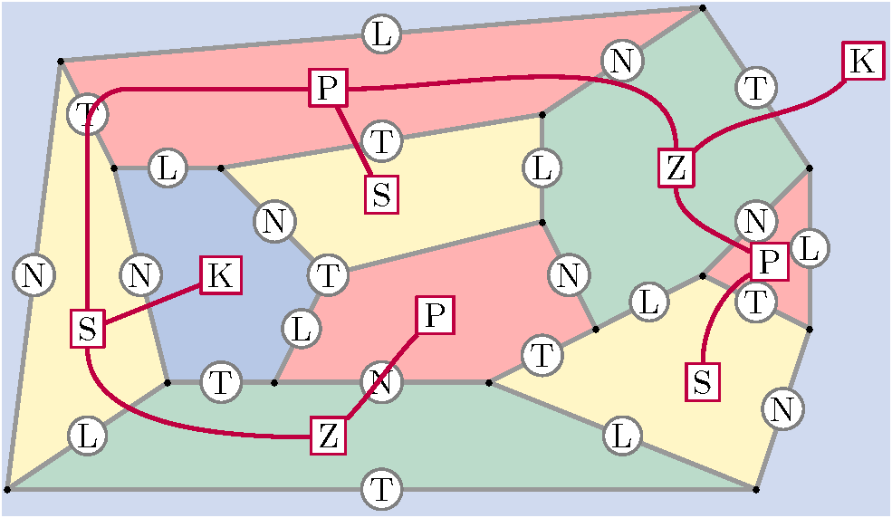 A bizonyításhoz kössünk össze minden tartományt azzal a szomszédjával, amelyik alapján kiszíneztük. Jelöljünk ki minden tartományban egy belső pontot fővárosnak, ezek legyenek az összeköttetések végpontjai. Könnyen meggondolható, hogy így egy fagráfot kapunk, amelyet \(\displaystyle F^*\)-gal fogunk jelölni. A \(\displaystyle ^*\)-gal arra utalunk, hogy \(\displaystyle F^*\) a \(\displaystyle G\) síkbarajzolt gráf ún. duális gráfjának, \(\displaystyle G^*\)-nak az éleiből áll. (Így \(\displaystyle F^*\) a \(\displaystyle G^*\) egy feszítőfája.) Világos az is, hogy az összeköttetéseket be lehet úgy rajzolni, hogy: