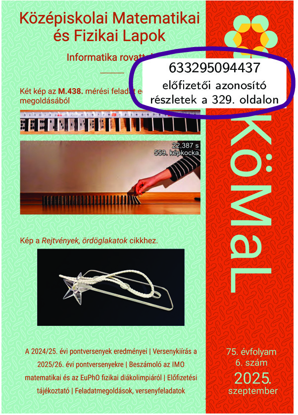 A részvétel pontversenyeinkben a 2025/2026-os tanévben is térítésmentes. Kérjük azonban versenyzőink szüleit, hozzátartozóit, vagy az őket támogató intézményeket, cégeket, hogy előfizetésükkel és adományaikkal segítsék a KöMaL fennmaradását.