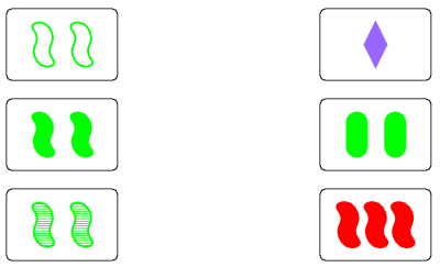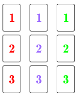 Adja magát az ötlet, hogy a kilenc kártyát rendezzük négyzet alakba: például az első oszlopban a piros, a másodikban a lila, a harmadikban a zöld lapok, míg az első sorban az 1-et, a másodikban a 2-t, a harmadikban a 3-at ábrázoló kártyák szerepeljenek.