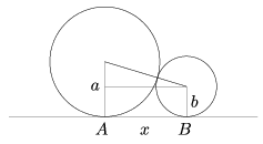 Megoldás: A dinnyesor két szomszédos dinnyéjére az ábra szerint igaz, hogy az asztalon lévő érintkezési pontjaik távolsága \(\displaystyle AB=x=2\sqrt{ab}\), ahol a és b a két gömb sugara. Ennek alapján a feladatban meghatározott dinnyesor hossza: