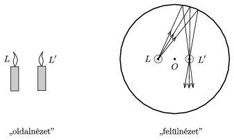 Máris válaszolhatunk az a) kérdésre: olyan irányból kell nézni a vázára, hogy az egységnyi nagyítású, valódi képet létrehozó sugarak jussanak a megfigyelő szemébe. Feltételezve, hogy a hengertükör viszonylag nagy nyílásszögben is tökéletes leképezést valósít meg - ahogy ezt a gömbtükröknél a középiskolában feltételezzük -, a képet és a tárgyat összekötő egyenesre (függőleges síkra) merőleges irányból is nézhetjük a jelenséget (2. ábra). Innen nézve, éppen egymás mellett látjuk a lángot (L) és annak (vízszintes irányban fordított, függőleges irányban egyenes állású) valódi képét (L').