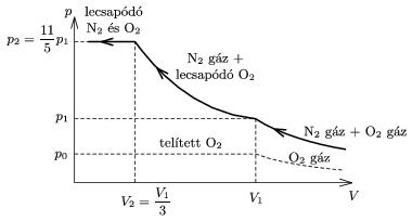 Az oxigén egyelőre ismeretlen p0 telítési nyomását abból számíthatjuk ki, hogy a nitrogén még a V1\(\displaystyle \rightarrow\)V2 összenyomás közben is gáz maradt. Elhanyagolva a cseppfolyós oxigén térfogatát a tartályban, valamint a nitrogéngázt továbbra is ideális gáznak tekintve felírhatjuk rá a Boyle-Mariotte-törvényt: