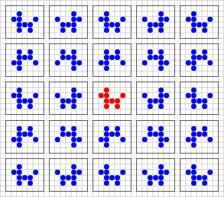 Mi történik az alakzatokkal a sejtszámok összeadásakor? Azok a mezők lesznek befestve, amelyek páratlan sok kiindulási sejt esetében lesznek n generáció múlva befestve. Ezt hívhatjuk az alakzatok egymásra szuperponálásának vagy összeadásának is. Az alábbi ábrán egy két sejtből álló alakzatra alkalmaztuk ezt az elvet. (Az egyik sejt leszármazottjait piros, a másik sejt utódait kék színnel jelöltük.)