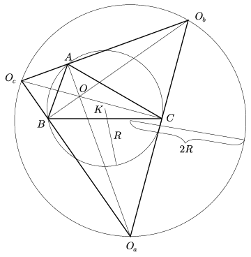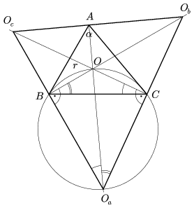 Tudjuk, hogy O a háromszög három belső szögfelezőjének, Oa, Ob és Oc pedig két-két külső- és egy-egy belső szögfelezőjének a metszéspontja. Mivel a háromszög bármely csúcsához tartozó külső és belső szögfelező merőleges egymásra, ezért igaz a következő: