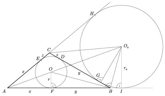 A továbbiakban a beírt és a hozzáírt körök sugarait fejezzük ki az oldalakkal és a területtel. Ehhez először meghatározzuk ezen körök és az oldalegyenesek érintési pontjainak a háromszög csúcsaitól való távolságát. Jelöljük az érintési pontokat a 6. ábrán látható módon D, E, F, G, H, I-vel. Mivel egy külső pontból egy körhöz húzott két érintőszakasz hossza egyenlő, ezért AH=AI, BG=BI és CH=CG, továbbá a 6. ábra jelöléseinek megfelelően AE=AF=x, BD=BF=y és CD=CE=z.