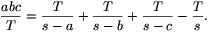 | (4) | abc=s(s-b)(s-c)+s(s-a)(s-c)+s(s-a)(s-b)-(s-a)(s-b)(s-c). |