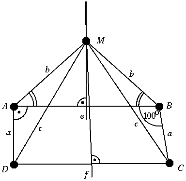 Legyen ABCD egy olyan négyszög, amelyben az A-nál levő szög derékszög, a B-nél levő szög 100o, továbbá AD=BC=a. Legyen e és f az AB illetve CD oldalak felező merőlegese. Feltéve, hogy a derékszög nem 100 fokos, az AB és CD oldalak nem párhuzamosak, ezért e és f metszi egymást; legyen a metszéspontjuk M.