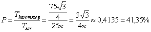 Mennyi a valószínűsége annak, hogy ha találomra kijelölünk egy pontot a kör belső tartományában, akkor az egyben a fenti sokszögek belső tartományába is esik? Megoldás: A valószínűséget a beírt sokszög területének és a teljes kör területének aránya adja.