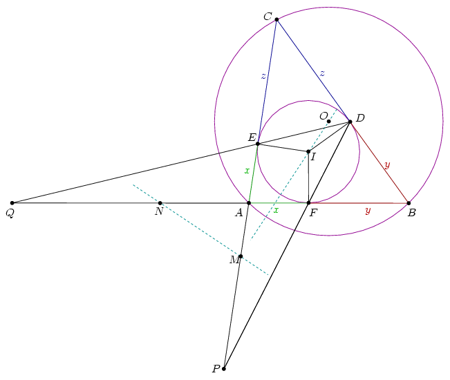 Legyen AE=AF=x, BD=BF=y és CD=CE=z. A QA előjeles távolságot jelöljük u-val; u akkor legyen pozitív, ha QA és AB azonos irányú. A Menelaosz-tétel szerint