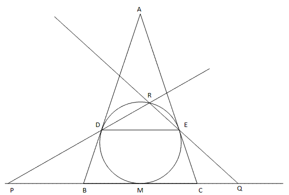. Tehát ha nézzük az RDE körülírt körét, ezt az AE egyenes érinti. Hasonló módon az AD egyenes is érinti ezt a kört. Viszont mivel AD=AE, BD=BM, CM=CE, ez pont a beírt kör lesz. Tehát azt kaptunk, hogy ebben az esetben az ABC beírt körének DE "fölötti", vagyis BC-vel ellentétes oldalán lévő részén van. Nyilván minden ilyen pontot megkapunk, mert ha választunk rajta egy pontot, azt összekötjük D és E-vel, és a hosszabításaikat elnevezzük P és Q-nak, akkor azok jók lesznek, csak ezt a gondolatmenetet meg kell fordítani.
