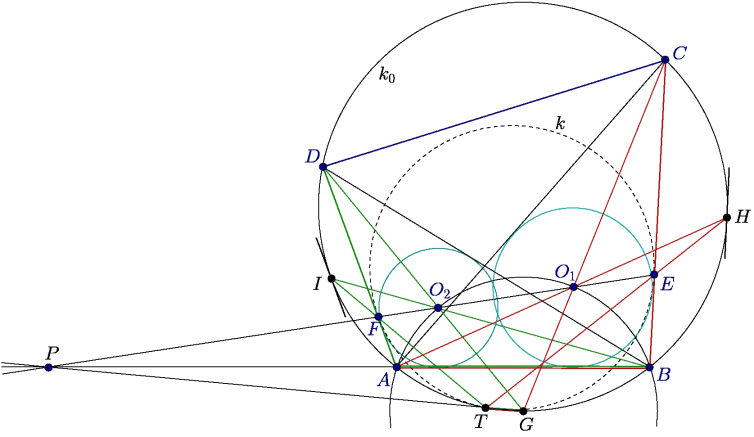 (b) Legyen az AB és EF egyenesek metszéspontja P, a PG egyenes és k0 második metszéspontja T. (Ha AB és EF párhuzamosak, akkor P a két egyenes ideális pontja és T=G.)