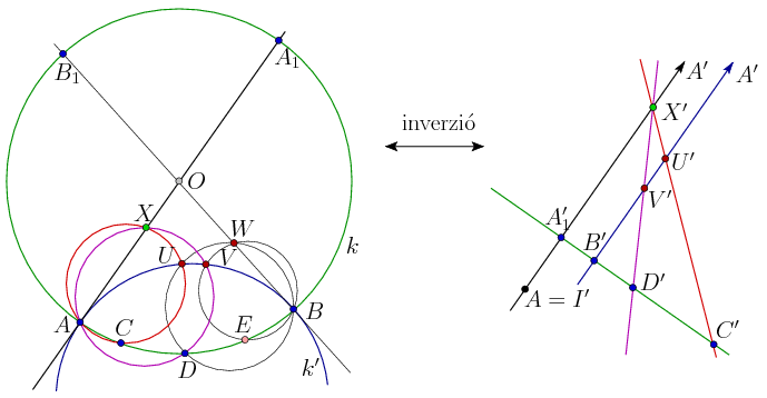 Helyezzük el az ábrát az inverzív síkon, amelynek csak egy ideális pontja van; legyen ez I. Alkalmazzunk egy A pólusú inverziót; a pontok képe legyen A'=I,I'=A,A1',B',C',D',X',U',V'. Mivel az A-n átmenő körök képe egyenes, az B',C',D' pontok, az U',V',D' pontok, az X',U',C' pontok, továbbá az X',V',D' pontok egy egyesen vannak. Mivel az AA1X egyenes érinti a k' kört, képeik, az AA1'X' és a B'U'V' egyenes párhuzamosak.