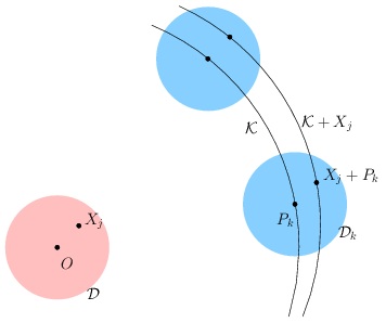 Minden egyes \(\displaystyle 1\le k\le n\)-re, a \(\displaystyle \mathcal{D}_k=\mathcal{D}+P_k\) körbe eső rácspontok \(\displaystyle X_1+P_j,\ldots,X_r+P_j\). A \(\displaystyle \mathcal{D}_1,\ldots,\mathcal{D}_n\) körlapok együttesen az \(\displaystyle X_j+P_k\) alakú rácspontokat (\(\displaystyle 1\le j\le r\), \(\displaystyle 1\le k\le n\)) tartalmazzák.