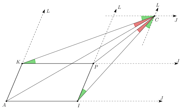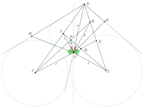Megjegyzés. Általában, ha az \(\displaystyle A,I,J\) pontok, illetve az \(\displaystyle A,K,L\) pontok egy egyenesre esnek, \(\displaystyle P\) az \(\displaystyle IL\) és \(\displaystyle JK\) egyenesek metszéspontja, továbbá \(\displaystyle C\) olyan pont, ami nem esik ezekre az egyenesekre, akkor (irányított szögekkel) \(\displaystyle JCI\sphericalangle=KCL\sphericalangle\) akkor és csak akkor teljesül, ha \(\displaystyle ICP\sphericalangle=ACK\sphericalangle\). (Fehér Zsombor észrevétele.)