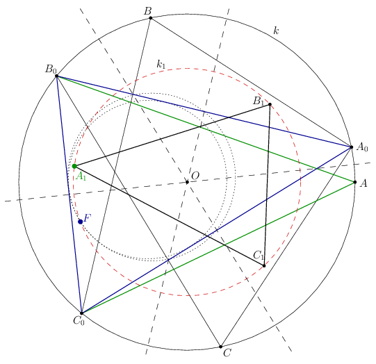 Az \(\displaystyle A_0B_0C_0\) és \(\displaystyle AC_0B_0\) háromszögek egybevágók, mert \(\displaystyle {A_0OB_0}\sphericalangle={C_0OA}\sphericalangle=\alpha+\beta\) és \(\displaystyle {C_0OA_0}\sphericalangle={AOB_0}\sphericalangle=\gamma+\alpha\); a két háromszög egymás tükörképe a közös \(\displaystyle B_0C_0\) oldal felező merőlegesére. A szimmetria miatt a két háromszög Feuerbach-pontja, vagyis \(\displaystyle F\) és \(\displaystyle A_1\) is egymás tükörképe. Hasonlóan látjuk, hogy az \(\displaystyle F\) tükörképe az \(\displaystyle A_0C_0\) szakasz felező merőlegesére \(\displaystyle B_1\), az \(\displaystyle A_0B_0\) szakasz felező merőlegesére pedig \(\displaystyle C_1\). Ezek a felező merőlegesek mind átmennek az \(\displaystyle O\) ponton, így az \(\displaystyle F,A_1,B_1,C_1\) pontok egy \(\displaystyle O\) körüli \(\displaystyle k_1\) körön vannak.