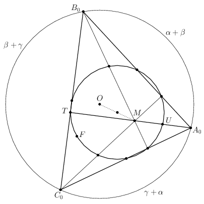 Először is vegyük észre, hogy az \(\displaystyle A_0B_0C_0\) háromszög hegyesszögű: a szögei \(\displaystyle \frac{\beta+\gamma}2\), \(\displaystyle \frac{\gamma+\alpha}2\) és \(\displaystyle \frac{\alpha+\beta}2\). Legyen az \(\displaystyle A_0B_0C_0\) háromszög magasságpontja \(\displaystyle M\), az \(\displaystyle A_0\)-ból induló magasság talppontja \(\displaystyle T\), az \(\displaystyle A_0M\) szakasz felezőpontja \(\displaystyle U\); mivel a háromszög hegyesszögű, az \(\displaystyle M\), \(\displaystyle T\), \(\displaystyle U\) pontok különbözőek, és az \(\displaystyle M\) pont a \(\displaystyle TU\) szakasz belsejében van. A Feuerbach-kör átmegy a \(\displaystyle T\) és \(\displaystyle U\) pontokon, így az \(\displaystyle M\) pont a Feuerbach-kör belsejébe esik. Mint jól ismert, az \(\displaystyle A_0B_0C_0\) háromszög Feuerbach-körének középpontja az \(\displaystyle OM\) szakasz felezőpontja, így \(\displaystyle O\) is a Feuerbach-kör belsejében van.