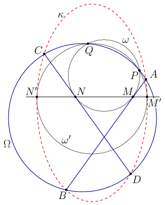 A. 685. Legyen \(\displaystyle AB\) és \(\displaystyle CD\) két húr az \(\displaystyle \Omega\) körben. Válasszunk ki egy olyan \(\displaystyle \omega\) kört, amely érinti az \(\displaystyle AB\) és \(\displaystyle CD\) szakaszokat az \(\displaystyle M\), illetve \(\displaystyle N\) belső pontjaikban, és metszi az \(\displaystyle \Omega\) kört a \(\displaystyle P\) és \(\displaystyle Q\) pontokban. Tegyük fel, hogy egy \(\displaystyle \Omega\)-tól és \(\displaystyle \omega\)-tól különböző harmadik kör, \(\displaystyle \omega'\) szintén átmegy a \(\displaystyle P\) és \(\displaystyle Q\) pontokon, és metszi az \(\displaystyle MN\) egyenest az \(\displaystyle M'\) és \(\displaystyle N'\) pontokban. Bizonyítsuk be, hogy az \(\displaystyle A\), \(\displaystyle B\), \(\displaystyle C\), \(\displaystyle D\), \(\displaystyle M'\) és \(\displaystyle N'\) egy olyan kúpszeleten vannak, amely érinti az \(\displaystyle \omega'\) kört az \(\displaystyle M'\) és \(\displaystyle N'\) pontokban.
