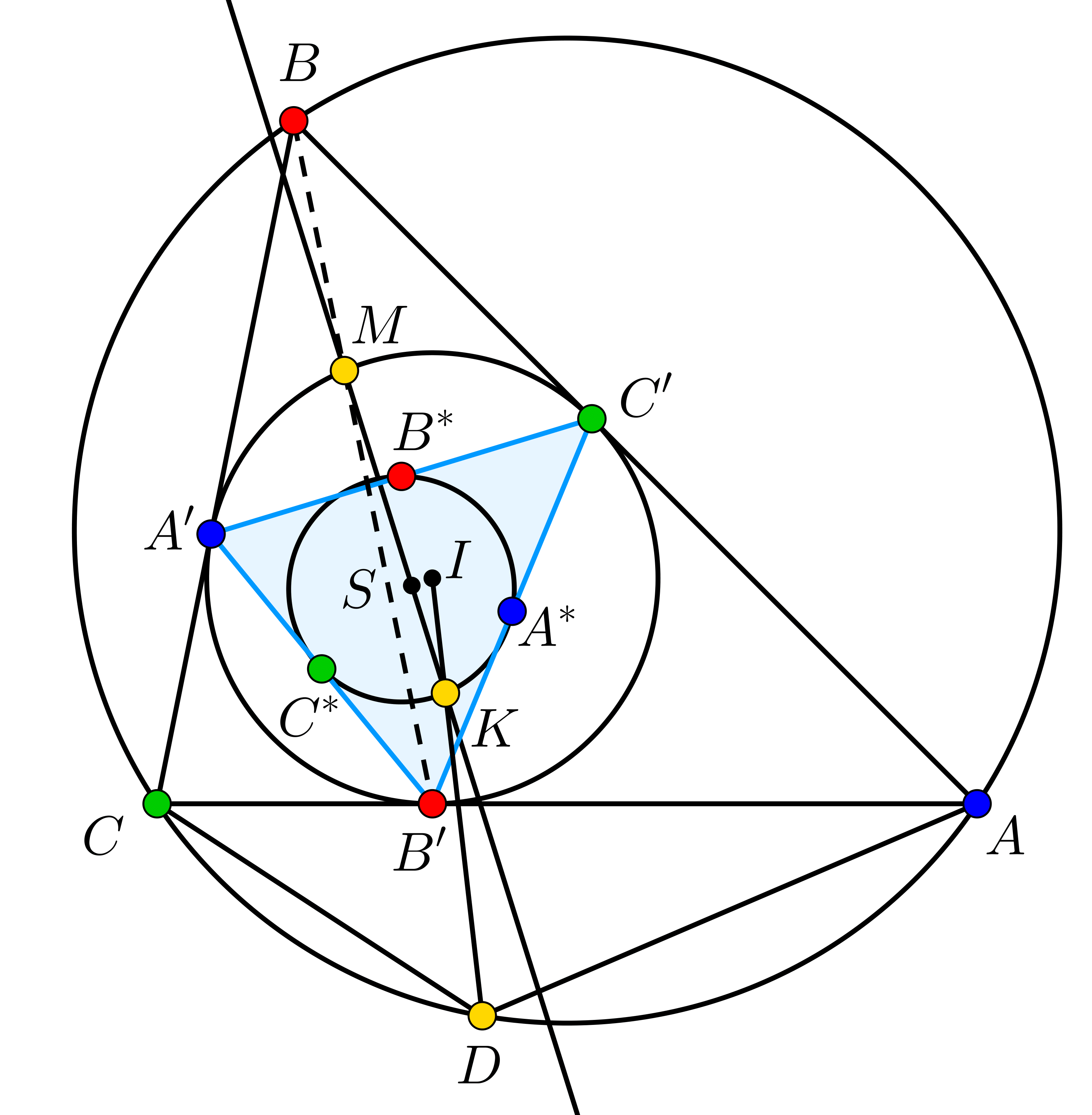Now let's apply a homothety from centroid \(\displaystyle S\) of \(\displaystyle A'B'C'\) with a ratio of \(\displaystyle -2\): it maps \(\displaystyle A^*\) to \(\displaystyle A'\), and similar is true for \(\displaystyle B\) and \(\displaystyle C\). Let \(\displaystyle M\) denote the imgae of \(\displaystyle K\). Then \(\displaystyle M\) must be on the incribed circle, \(\displaystyle \omega\), and we have seen that \(\displaystyle A'B'C'M\) must be harmonic (since \(\displaystyle ABCD\) was harmonic, and both the inversion and the homothety preserve harmonic quadrilaterals). Therefore, diagonal \(\displaystyle B'M\) must go through the tangents of \(\displaystyle \omega\) at \(\displaystyle A'\) and \(\displaystyle C'\) (i.e. \(\displaystyle BC\) and \(\displaystyle BA\)), which is exactly point \(\displaystyle B\), and this was to be proved.