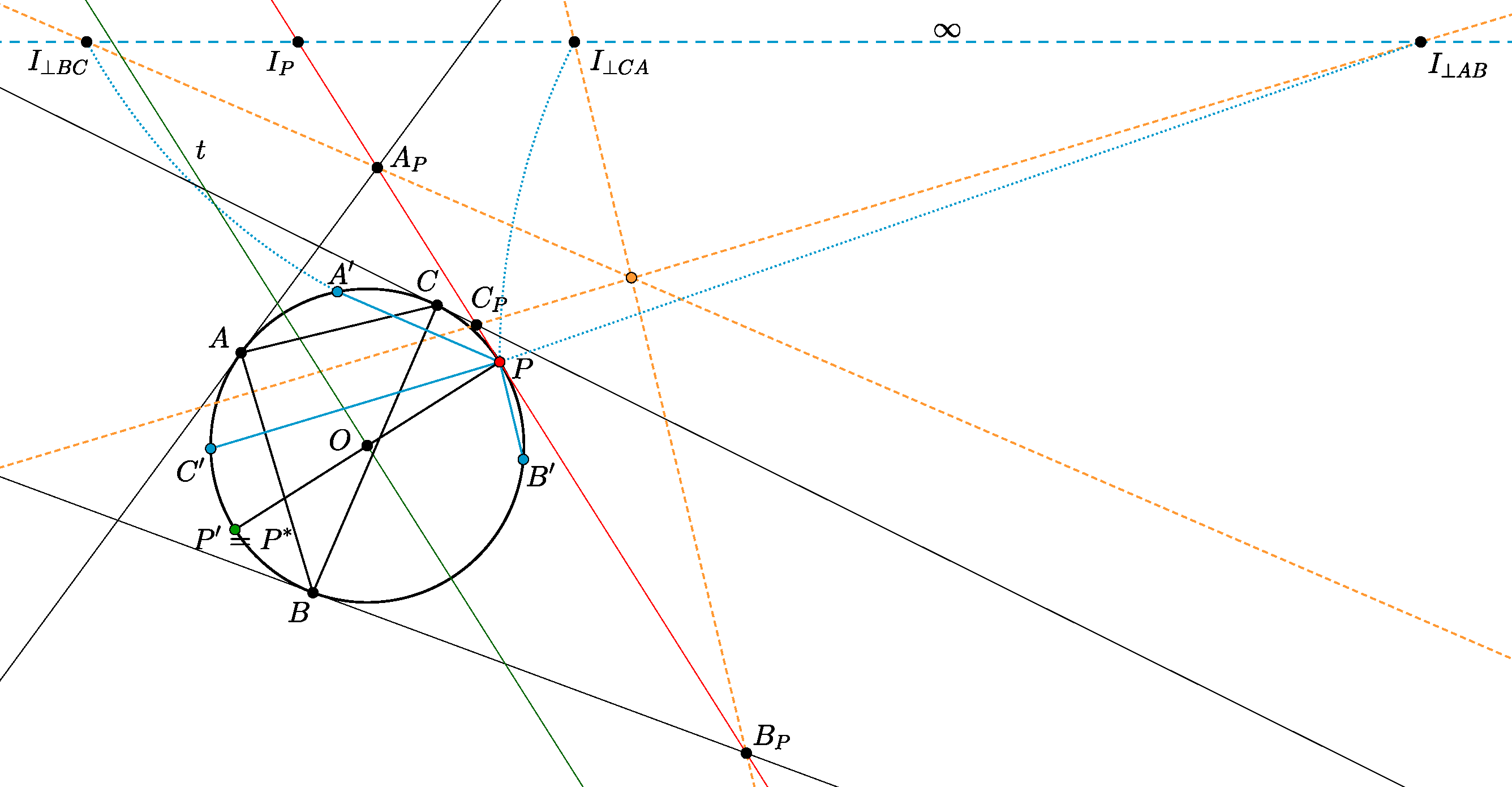1. megoldás: Jelöljük a kör középpontját \(\displaystyle O\)-val. A projektív síkon fogunk dolgozni. Az ideális egyenest jelöljük a síkon vázlatosan \(\displaystyle \infty\)-vel. Legyen a \(\displaystyle P\)-beli érintő ideális pontja \(\displaystyle I_P\), továbbá legyenek az \(\displaystyle AB,BC,CA\) egyenesekre merőleges irányú ideális pontok rendre \(\displaystyle I_{\perp AB}, I_{\perp BC}, I_{\perp CA}\). Olyan \(\displaystyle P\) pontok érdekelnek minket, melyekre az \(\displaystyle A_PI_{\perp BC},B_PI_{\perp CA},C_PI_{\perp AB}\) egyenesek konkurensek. Ez ekvivalens azzal, hogy \(\displaystyle (A_P,B_P;C_P,I_P)=(I_{\perp BC},I_{\perp CA};I_{\perp AB},I_P)\). Vetítsük \(\displaystyle P\)-ből az \(\displaystyle (I_{\perp BC},I_{\perp CA};I_{\perp AB},I_P)\) pontnégyest: ha \(\displaystyle A',B',C'\) jelölik a \(\displaystyle P\)-ből \(\displaystyle BC,CA,AB\) egyenesekre állított merőlegeseknek a körrel vett második metszéspontjait, akkor azt kapjuk, hogy \(\displaystyle (I_{\perp BC},I_{\perp CA};I_{\perp AB},I_P)=(A',B';C',P)\) (hiszen a \(\displaystyle PI_P\) egyenes érinti a kört).