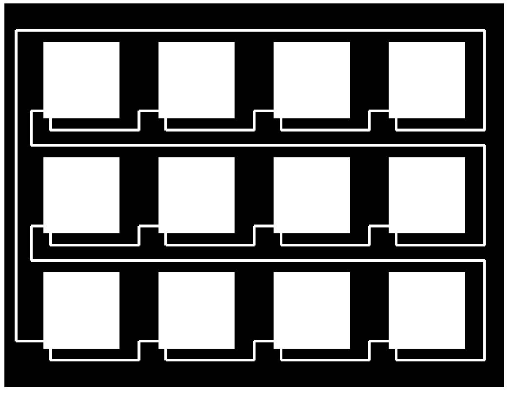 Így kapunk egy táblát, melyben pontosan egyféleképpen lehet minden fehér mezőt érintve \(\displaystyle A\)-ból \(\displaystyle B\)-be jutni. Parkettázzunk ki egy \(\displaystyle a\times b\) méretű négyzetrácsot ilyen táblákkal, köztük \(\displaystyle m\) vastagságú fekete mezőkkel az ábra szerint (az \(\displaystyle a=3\), \(\displaystyle b=4\) esetben).