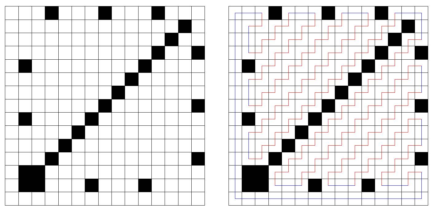 ahol \(\displaystyle l\) lineáris függvénye \(\displaystyle n=4k+7\)-nek. Ha egy \(\displaystyle 4k+7\) méretű konstrukció köré fentről és a jobbról egy, kettő vagy három fekete sávot rakunk, akkor kapunk egy konstrukciót \(\displaystyle 4k+8\), \(\displaystyle 4k+9\) illetve \(\displaystyle 4k+10\)-re, vagyis minden kellően nagy \(\displaystyle n\) esetén