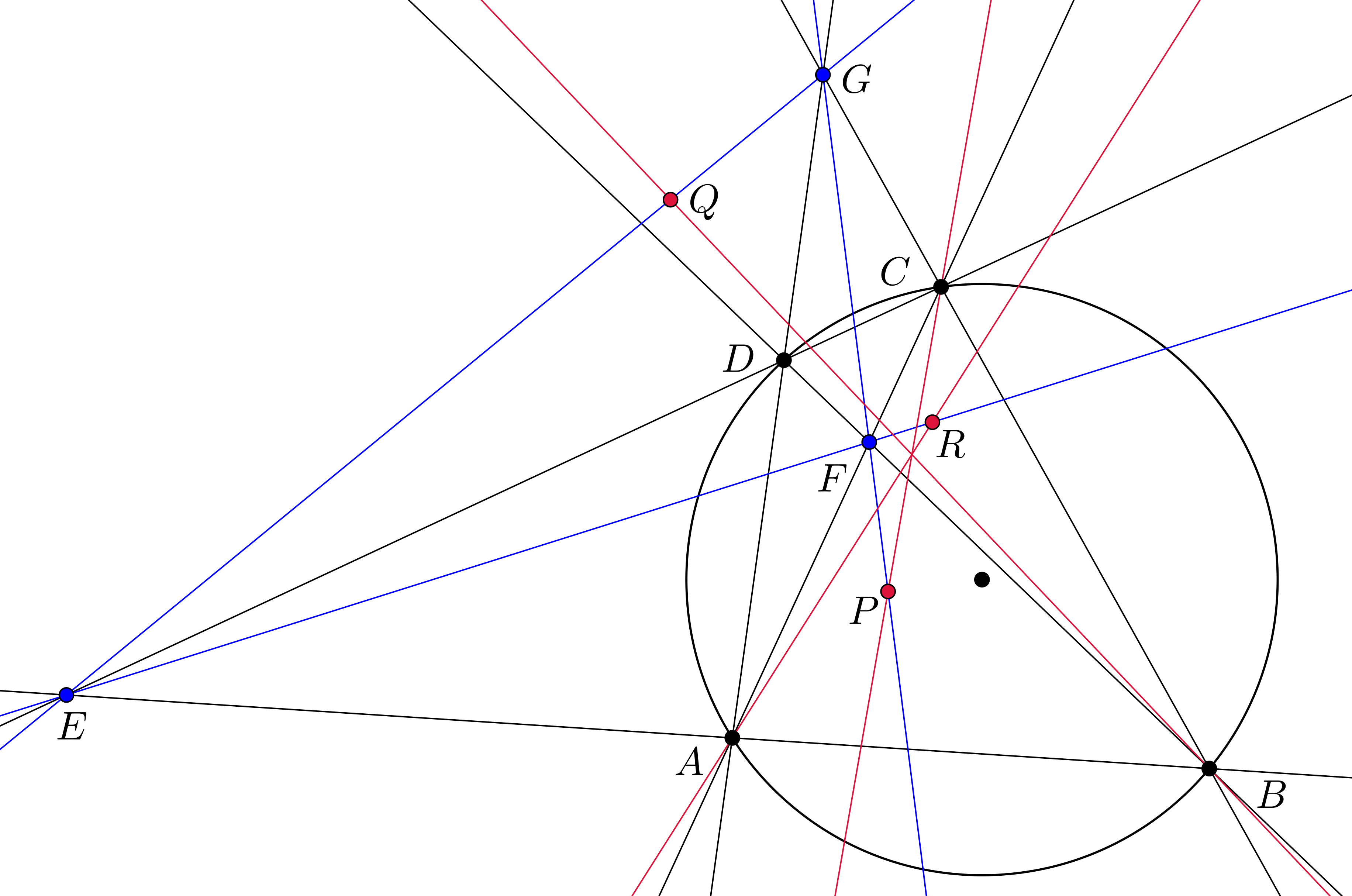 Adottak az \(\displaystyle A\), \(\displaystyle B\), \(\displaystyle C\), \(\displaystyle D\) általános helyzetű pontok egy körön. Legyen az \(\displaystyle AB\) és \(\displaystyle CD\) egyenesek metszéspontja \(\displaystyle E\), \(\displaystyle AC\) és \(\displaystyle BD\) metszéspontja \(\displaystyle F\), \(\displaystyle AD\) és \(\displaystyle BC\) metszéspontja pedig \(\displaystyle G\). Jelölje az \(\displaystyle EFG\) háromszögben az \(\displaystyle E\), \(\displaystyle F\), \(\displaystyle G\) csúcsokhoz tartozó magasságvonalak talppontjait rendre \(\displaystyle P\), \(\displaystyle Q\), illetve \(\displaystyle R\).