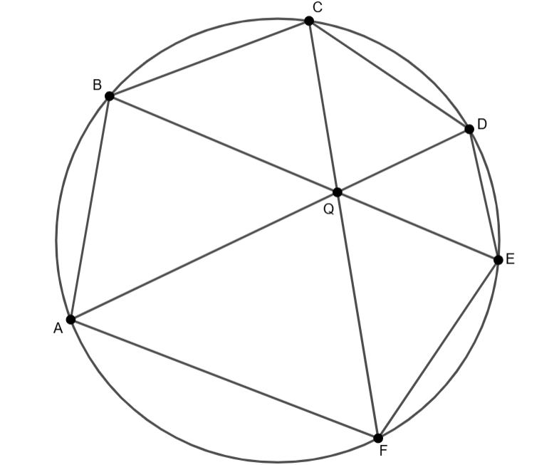 Végül a konstans tag esetén azt kell bizonyítanunk, hogy \(\displaystyle AB\cdot CD\cdot EF=BC\cdot DE\cdot FA\). A Brianchon-tétel miatt \(\displaystyle AD\), \(\displaystyle BE\) és \(\displaystyle CF\) egy ponton mennek át (jelölje \(\displaystyle Q\)). A kerületi szögek tétele miatt az \(\displaystyle ABQ\) és \(\displaystyle EQD\) háromszögek hasonlók, így \(\displaystyle AB/DE=AQ/EQ\). Hasonlóan, \(\displaystyle EF/BC=EQ/CQ\) és \(\displaystyle CD/FA=CQ/AQ\). Ezeket összeszorozva megkapjuk a bizonyítandót.