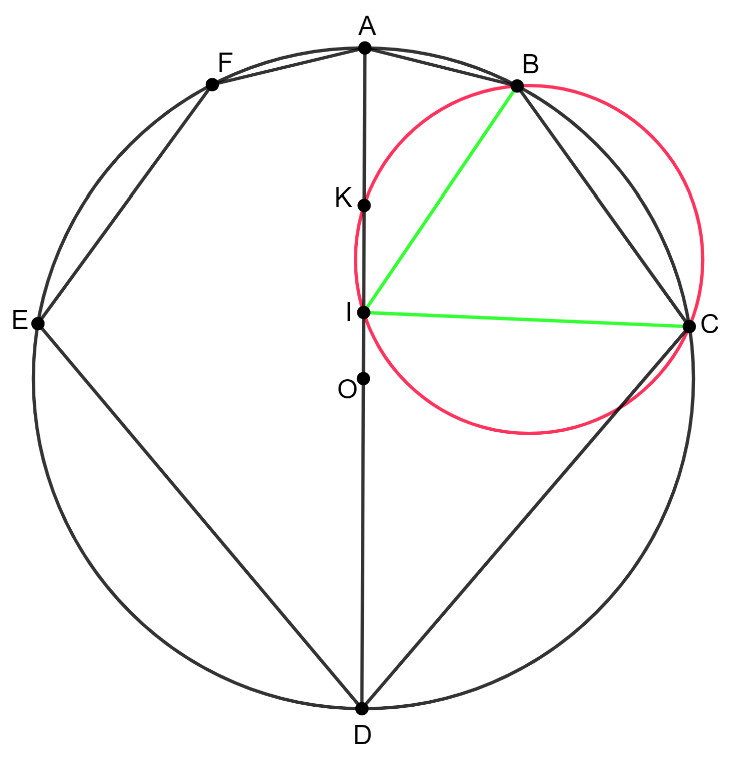 Megoldás: Be fogjuk bizonyítani, hogy a hatszög szimmetrikus az egyik átlójára. Először megmutatjuk, hogy ha a bicentrikus \(\displaystyle ABCDEF\) hatszög szimmetrikus az \(\displaystyle AD\) átlójára, akkor \(\displaystyle AB+DE=2R\). Jelölje \(\displaystyle I\) az \(\displaystyle ABCDEF\) hatszög beírt körének középpontját. \(\displaystyle I\) nyilván rajta van az \(\displaystyle AD\) átlón (a hatszög szimmetriatengelyén). Jelölje \(\displaystyle K\) a \(\displaystyle BCI\) kör és az \(\displaystyle AD\) egyenes második metszéspontját. Egyszerű szögszámolással \(\displaystyle CKD\sphericalangle=CBI\sphericalangle=\frac12CBA\sphericalangle=\frac12(180^\circ-ADC\sphericalangle)\), és ebből azonnal következik, hogy a \(\displaystyle CKD\) háromszög egyenlőszárú, tehát \(\displaystyle DC=DK\). Hasonlóan, \(\displaystyle AB=AK\), így végül \(\displaystyle AB+DE=AB+DC=DK+AK=2R\), ami a bizonyítandó volt.