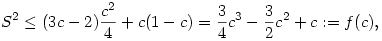1 feltétel mellett tehát legnagyobb értékét a c=1 helyen veszi fel. Ezek alapján S lehetséges legnagyobb értéke Smax =f(1)=1/4, amit z=0, x=y=1/2 esetén, illetve a kezdetben z-re tett feltételt mellőzve szimmetria okok miatt még x=0, y=z=1/2, illetve y=1, x=z=1/2 esetén vesz fel.