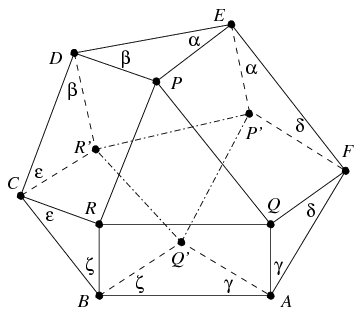 Megoldás: Tegyük fel, hogy a (2) állítást már igazoltuk. Ekkor a BC, DE, FA oldalak felezőmerőlegesei megegyeznek az R'Q', P'R', Q'P' szakaszok felezőmerőlegeseivel, melyek nyilván a P'Q'R' háromszög köré írható kör középpontjában metszik egymást, igazolva az (1) állítást. A (2) állítás igazolásához először a következő önmagában is érdekes segédtételt bizonyítjuk.