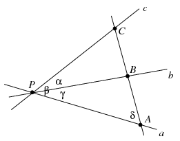 Megoldás: Jelölje a három egyenest értelemszerűen a,b,c. A jelölést ciklikusan megváltoztatva a baloldali kifejezés nem változik, a körüljárási irányt megfordítva pedig ellentettjére változik. Ezért nyugodtan feltehetjük, hogy az A,B,C pontok az ábrán látható módon helyezkednek el. Azt is feltehetjük, hogy a PA,PB,PC szakaszok hosszának előjele pozitív. Az APB,APC,BPC szögeket jelölje rendre