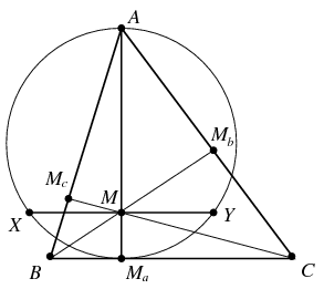 Megoldás. A szokásos jelöléseket használva az \(\displaystyle AM_a\) magasságvonalra merőleges \(\displaystyle XY\) húr hossza, lévén \(\displaystyle AXM_a\) és \(\displaystyle AYM_a\) egybevágó derékszögű háromszögek, a magasságtétel alapján