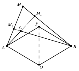 \(\displaystyle AMB\sphericalangle=M_aMM_b\sphericalangle=180^\circ-M_aCM_b\sphericalangle =180^\circ-ACB\sphericalangle=180^\circ-AOB\sphericalangle.\)