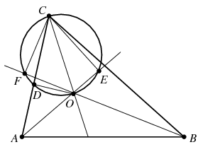Megoldás. A szögfelezők a háromszögbe írható kör \(\displaystyle O\) középpontjában metszik egymást. Az \(\displaystyle AOB\), \(\displaystyle BOC\), \(\displaystyle COA\) szögek nagysága rendre