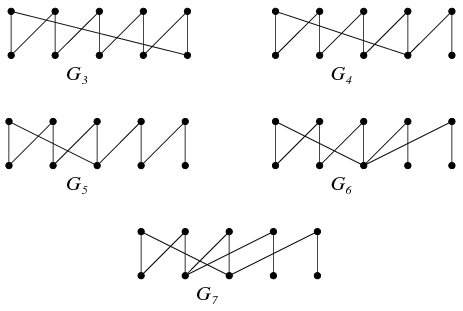 Ha a gráf összefüggő, akkor egy 10, egy 8, egy 6, vagy egy 4 hosszú kört tartalmaz. A 10 hosszú kör esetén meg is kaptuk az egész gráfot, ezt jelölje \(\displaystyle G_3\). Ha 8 hosszú körünk van, akkor ez mindkét színosztályból egy-egy csúcsot kihagy, melyek össze kell legyenek kötve egy éllel, hiszen a kör csúcsait egymás között kell párosítanunk, továbbá ennek az élnek az első színosztályba eső végpontja össze van kötve a 8 hosszú kör másik színosztályba eső valamelyik csúcsával. Így kapjuk a \(\displaystyle G_4\) gráfot. Ha 6 hosszú körünk van, akkor ez mindkét színosztályból két-két csúcsot hagy ki, melyek egymás között össze kell legyenek párosítva. Ebben a párosításban mindkét él első színosztályba eső végpontja össze van kötve a második színosztály valamelyik pontjával. Három esetet különböztethetünk meg, mivel legalább az egyiknek a 6 hosszú körhöz kell csatlakoznia. Ha pontosan az egyik csatlakozik a 6 hosszú körhöz, ahhor a \(\displaystyle G_5\) gráfot kapjuk, ha pedig mindkettő, akkor a \(\displaystyle G_6\), illetve a \(\displaystyle G_7\) gráfhoz jutunk aszerint, hogy a 6 hosszú körnek ugyanahhoz a csúcsához csatlakoznak, vagy sem.