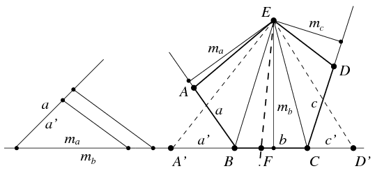 A párhuzamos szelők tételére alapuló jól ismert eljárással szerkesszünk olyan \(\displaystyle a',c'\) hosszúságú szakaszokat, hogy \(\displaystyle am_a=a'm_b\), illetve \(\displaystyle cm_c=c'm_b\) teljesüljön. Ezután a \(\displaystyle BC\) egyenesen vegyük fel az \(\displaystyle A', C'\) pontokat úgy, hogy a pontok \(\displaystyle A', B, C, D'\) sorrendben kövessék egymást, és \(\displaystyle A'B=a'\), \(\displaystyle CD'=c'\) teljesüljön. Ekkor az \(\displaystyle ABE\) és \(\displaystyle CDE\) háromszögek területe rendre megegyezik az \(\displaystyle A'BE\) és \(\displaystyle CD'E\) háromszögek területével, vagyis az \(\displaystyle A'D'E\) háromszög területe megegyezik az \(\displaystyle ABCDE\) ötszögével.