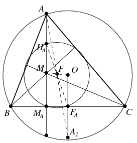 Megoldás. Az \(\displaystyle ABC\) háromszög Feuerbach-köre, melyet úgy kapunk, hogy a háromszög köré írható \(\displaystyle O\) középpontú \(\displaystyle k\) kört az \(\displaystyle M\) pontból felére kicsinyítjük, áthalad a \(\displaystyle BC\) oldal \(\displaystyle F_A\) felezőpontján, az \(\displaystyle AM\) szakasz \(\displaystyle H_A\) felezőpontján és az \(\displaystyle AM\) magasságvonal \(\displaystyle M_A\) talppontján. Mivel az \(\displaystyle F_AM_AH_A\) háromszög derékszögű, a Feuerbach-kör \(\displaystyle F\) középpontja, mely az \(\displaystyle OM\) szakasz felezőpontja, egybeesik az \(\displaystyle F_AH_A\) szakasz felezőpontjával, tehát az \(\displaystyle OF_A\) szakasz az \(\displaystyle MH_A\) szakasznak \(\displaystyle F\)-re vonatkozó tükörképe.