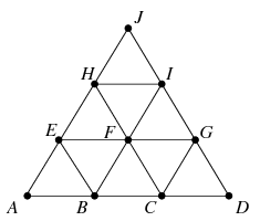 Megoldás. Ha valamelyik oldalról megtartottuk mind a 4 pontot, akkor egyetlen további pontot sem tarthatunk meg. Ha valamelyik oldalról pontosan 3 pontot tartottunk meg, akkor szimmetria okok miatt feltehetjük, hogy ezek az \(\displaystyle A,B,C\) vagy az \(\displaystyle A,B,D\) pontok. Az első esetben \(\displaystyle D\)-n kívül az \(\displaystyle E,F,H\) pontokat sem tarthatjuk meg, a \(\displaystyle G,I,J\) pontokat viszont igen. Tehát ebben az esetben 6 pont megtartható, de több nem. A másik esetben \(\displaystyle C\)-n kívül az \(\displaystyle E,I,J\) pontokat sem tarthatjuk meg, a \(\displaystyle G,H\) pontok közül pedig legfeljebb egyet tarthatunk meg, tehát összesen legfeljebb 5 pontot.