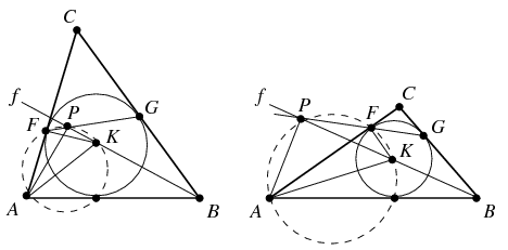 Vegyük észre, hogy \(\displaystyle AFK\sphericalangle=APK\sphericalangle=90^\circ\), vagyis az \(\displaystyle A,F,K\) és \(\displaystyle P\) pontok egy körön helyezkednek el. Ha \(\displaystyle P=F\), akkor az állítás nyilvánvaló. Ha \(\displaystyle P\) a háromszög belsejébe esik, akkor az \(\displaystyle AFPK\) húrnégyszögben \(\displaystyle FPK\sphericalangle=180^\circ-FAK\sphericalangle=180^\circ-\alpha/2\). Ezért az \(\displaystyle FPB\) és \(\displaystyle GPB\) szögek egymást \(\displaystyle 180^\circ\)-ra egészítik ki, tehát a \(\displaystyle P\) pont az \(\displaystyle FG\) szakasz belső pontja lesz. Végül ha \(\displaystyle P\) a háromszögön kívül helyezkedik el, akkor az \(\displaystyle APFK\) húrnégyszögben \(\displaystyle FPK\sphericalangle=FAK\sphericalangle=\alpha/2\). Ezért ekkor az \(\displaystyle FPB\) és \(\displaystyle GPB\) szögek egyenlők, tehát a \(\displaystyle P\) pont a \(\displaystyle GF\) szakasz \(\displaystyle F\)-en túli meghosszabbítására esik.