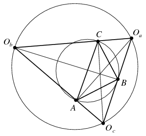 Mivel \(\displaystyle ABO_c\sphericalangle=90^\circ-\beta/2\) és \(\displaystyle BAO_c\sphericalangle=90^\circ-\alpha/2\), az \(\displaystyle O_aO_cO_b\) szög nagysága \(\displaystyle 90^\circ-\gamma/2\). Ezért a szinusz-tétel szerint