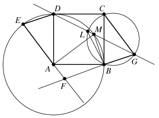 hegyesszöggel kifelé forgattuk, s így rendre az E, illetve G pontokat kaptuk. Az AE és BG egyenesek metszéspontja F. A GD egyenes a GCB kört, illetve a BDE kört másodszor rendre az L, illetve M pontban metszi. Bizonyítsuk be, hogy az A, B, F, L, M pontok egy körön vannak.