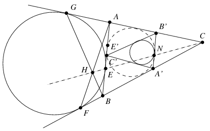 B. 4480. Az ABC háromszög AB oldalához tartozó hozzáírt köre az AB, BC és CA oldalegyeneseket rendre az E, F, G pontokban érinti. Az AF és BG egyenesek metszéspontja H. Az ABC háromszög középvonalai által alkotott háromszög beírt köre az AB-vel párhuzamos oldalt az N pontban érinti. Igazoljuk, hogy az E, H és N pontok egy egyenesre illeszkednek.