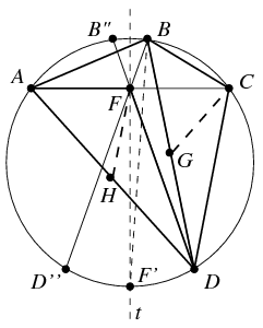 Megoldás: Elegendő annyit belátni, hogy ha a B csúcs különleges, akkor az A csúcs is az. Az AC, BD és AD szakaszok felezőpontját jelölje rendre F, G, illetve H. Legyen az AC szakasz felező merőlegese t. A B,D pontok t-re vett tükörképét jelölje B'',D'', továbbá legyen F' a t egyenesnek a B-t nem tartalmazó AC ívvel vett metszéspontja. Ekkor F' az AC ív felezőpontja, vagyis az a pont, amelyben a B-ből induló szögfelező az AC ívet metszi.