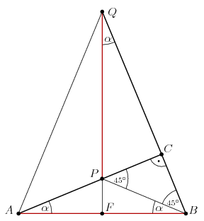 Az ABC és a QPC derékszögű háromszögek átfogója egyenlő, ezért a két háromszög egybevágó; többek közt BC=PC. A BPC háromszög tehát egyenlő szárú derékszögű háromszög, és . (Hasonlóan láthatjuk, hogy AC=QC, és az ACQ háromszög is egyenlő szárú derékszögű háromszög.) Ezután az ABC háromszög szögeiből leolvashatjuk, hogy