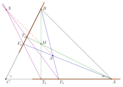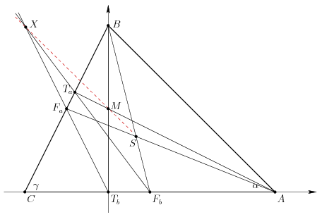 1. megoldás. Legyen a súlypont S, a magasságpont M, a TaFb és FaTb egyenesek metszéspontja X. Az A, FA, TA pontok az AC egyenesen, a B, Fb, Tb pontok pedig a BC egyesen vannak. A Papposz-tételt a az (A,FA,TA) és (B,Fb,Tb) ponthármasokra alkalmazva kapjuk, hogy AFb