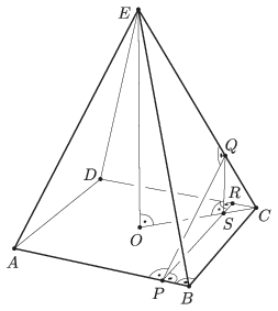 A gúla szabályosságából következően a \(\displaystyle CE\) egyenes merőleges vetülete az \(\displaystyle ABCD\) síkon a \(\displaystyle CO\) egyenes, ezért \(\displaystyle S\) rajta van a \(\displaystyle CO\) egyenesen. Mivel \(\displaystyle AP:PB=6:1\), a \(\displaystyle PR\) egyenes párhuzamos \(\displaystyle BC\)-vel, vagyis merőleges \(\displaystyle AB\)-re. \(\displaystyle PQ\) is merőleges \(\displaystyle AB\)-re, ezért \(\displaystyle AB\) merőleges a \(\displaystyle PQR\) síkra. Tehát az \(\displaystyle AB\)-re merőleges \(\displaystyle QS\) egyenes benne van a \(\displaystyle PQR\) síkban, vagyis \(\displaystyle S\) illeszkedik a \(\displaystyle PR\) egyenesre.
