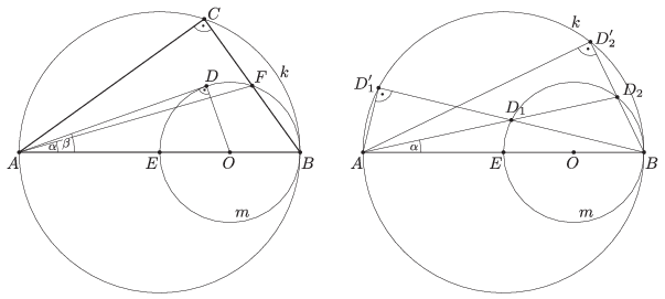 Megmutatjuk, hogy minden \(\displaystyle 0^{\circ} < \alpha \le \arcsin \frac{1}{3}\) esetén van olyan derékszögű háromszög, melyben az átfogó és az egyik befogóhoz tartozó súlyvonal szöge \(\displaystyle \alpha\). Ha a feltétel teljesül, akkor az \(\displaystyle AB\) egyenes egyik oldalára felmérve az \(\displaystyle \alpha \) szöget, annak \(\displaystyle AB\)-tól különböző szára metszi \(\displaystyle m\)-et a \(\displaystyle D_1\) és \(\displaystyle D_2\) pontokban, illetve érinti \(\displaystyle m\)-et \(\displaystyle D\)-ben, ha \(\displaystyle \alpha = \arcsin \frac{1}{3}\) (2. ábra). Mivel \(\displaystyle D_i\) rajta van \(\displaystyle m\)-en, azért ha \(\displaystyle B\)-ből kétszeresére nagyítjuk, akkor a kapott \(\displaystyle D_i'\) pont rajta lesz \(\displaystyle m\) kétszeresre nagyított képén, \(\displaystyle k\)-n, azaz az \(\displaystyle AB\) szakasz Thalész-körén. Ezért ha \(\displaystyle i=1,2\), akkor az \(\displaystyle ABD_i'\) háromszög derékszögű, és a \(\displaystyle BD'_i\) befogójához tartozó \(\displaystyle AD_i\) súlyvonala \(\displaystyle \alpha\) szöget zár be az átfogójával.