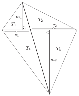 Megoldás. Először megmutatjuk, hogy a két-két szemközti háromszög területének szorzata egyenlő. Jelölje a hároszögek területét az ábra szerint \(\displaystyle T_1\), \(\displaystyle T_2\), \(\displaystyle T_3\) és \(\displaystyle T_4\). A háromszögeknek az egyik átlóhoz tartozó magasságai legyenek \(\displaystyle m_1\) és \(\displaystyle m_2\), ennek az átlónak az átlók metszéspontja által meghatározott szakaszai pedig legyenek \(\displaystyle e_1\) és \(\displaystyle e_2\).