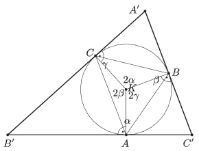Ha \(\displaystyle ABC\) hegyesszögű (2. ábra), akkor a körülírt köre az \(\displaystyle A'B'C'\) háromszögnek beírt köre. A \(\displaystyle KAC'B\), \(\displaystyle KBA'C\) és \(\displaystyle KCB'A\) négyszögek húrnégyszögek, mert két-két szemközti szögük derékszög. A keresett szögek éppen ezen húrnégyszögek \(\displaystyle K\)-val szemközti szögei. Bármely húrnégyszögben a szemközti szögek összege \(\displaystyle 180^{\circ}\), ezért ebben az esetben az \(\displaystyle A'B'C'\) háromszög szögei \(\displaystyle 180^{\circ}-2\alpha\), \(\displaystyle 180^{\circ}-2\beta\) és \(\displaystyle 180^{\circ}-2\gamma\).