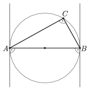 Megoldás. Jelöljük a háromszög csúcsait a szokásos módon \(\displaystyle A\), \(\displaystyle B\), \(\displaystyle C\)-vel. Ha a háromszög derékszögű, pl. \(\displaystyle \gamma =90^{\circ}\), akkor \(\displaystyle AB\) a körülírt kör átmérője, ezért a körülírt körhöz az \(\displaystyle A\)-ban és \(\displaystyle B\)-ben húzott érintők párhuzamosak (1. ábra), tehát ebben az esetben az érintők nem alkotnak háromszöget. A továbbiakban feltesszük, hogy az \(\displaystyle ABC\) háromszög nem derékszögű. Legyenek a körülírt körhöz a csúcsokban húzott érintők által alkotott háromszög csúcsai \(\displaystyle A'\), \(\displaystyle B'\) és \(\displaystyle C'\), a körülírt kör középpontja pedig \(\displaystyle K\). A kerületi és középponti szögek közti összefüggés alapján a körülírt kör \(\displaystyle A\)-t nem tartalmazó \(\displaystyle BC\) ívéhez tartozó középponti szög \(\displaystyle 2\alpha\), a \(\displaystyle B\)-t nem tartalmazó \(\displaystyle CA\) ívéhez tartozó középponti szög \(\displaystyle 2\beta\), a \(\displaystyle C\)-t nem tartalmazó \(\displaystyle AB\) ívéhez tartozó középponti szög pedig \(\displaystyle 2\gamma\). A kör érintője merőleges az érintési pontba húzott sugárra, ezért \(\displaystyle KA\perp B'C'\), \(\displaystyle KB\perp C'A'\) és \(\displaystyle KC\perp A'B'\). A továbbiakban megkülönböztetjük a hegyesszögű és a tompaszögű háromszög esetét.